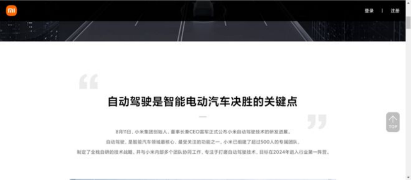 在小米官网首页上,赫然醒目的标语也很是乍眼:“自动驾驶是智能电动汽车决胜的关键点”。