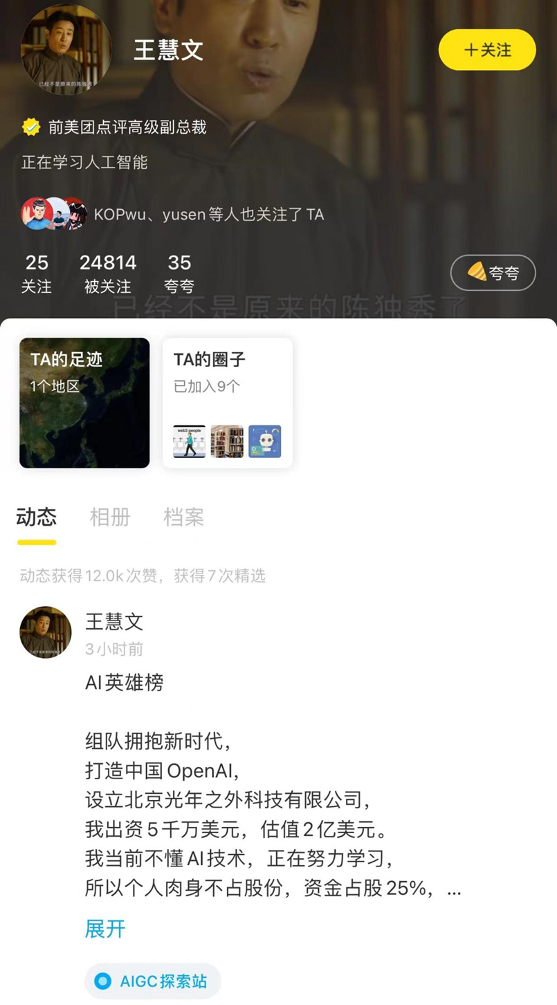 透过该社交平台,我们看到了这位互联网灵魂人物的更多动态。王慧文最早于2019年7月开启在此平台记录,在美团退休前后也曾发布少许动态,但一直到2022年3月起才算开始活跃,主要讨论话题包括Crypto、Web3、AR、物流学与宇宙等等。他的个人主页也显示其签名是“正在学习人工智能”,加入过“Web3研究所”、“读书会”、“科技圈大小事”等话题圈子。