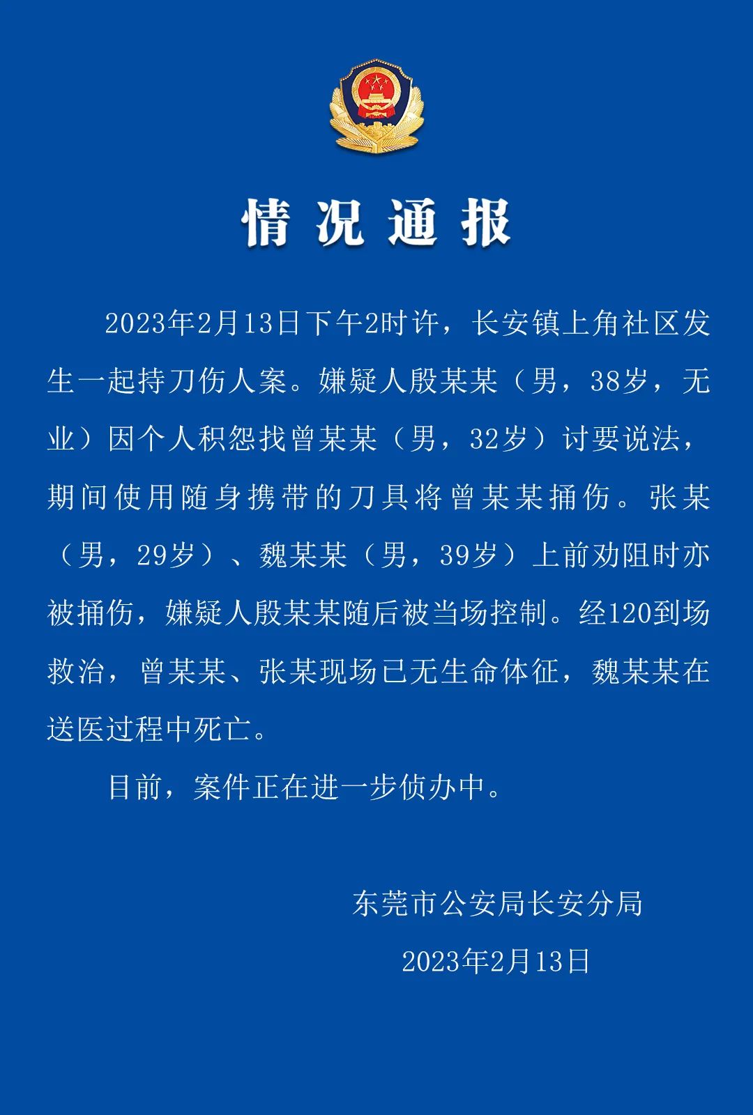 东莞市公安局长安分局官微通报,2月13日下午2时许,长安镇上角社区发生一起持刀伤人案。嫌疑人殷某某(男,38岁,无业)因个人积怨找曾某某(男,32岁)讨要说法,期间使用随身携带的刀具将曾某某捅伤。张某(男,29岁)、魏某某(男,39岁)上前劝阻时亦被捅伤,嫌疑人殷某某随后被当场控制。经120到场救治,曾某某、张某现场已无生命体征,魏某某在送医过程中死亡。