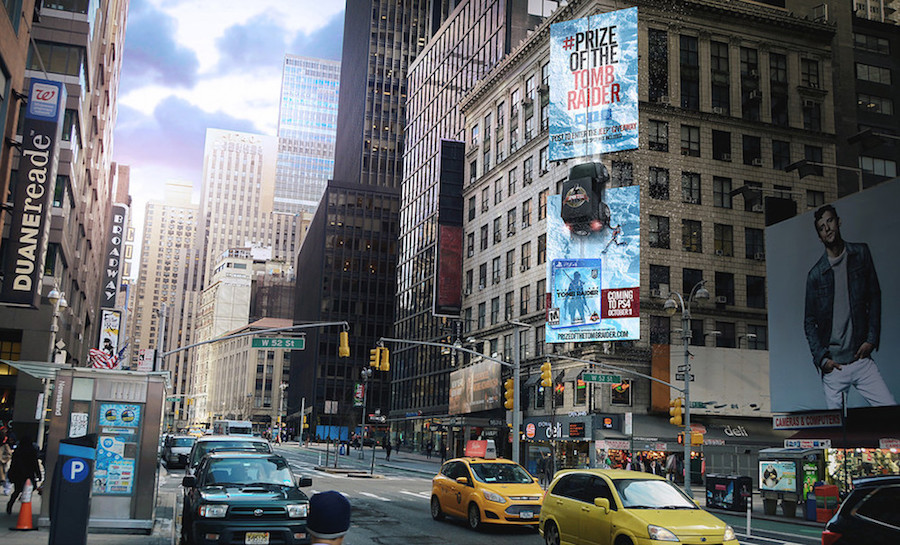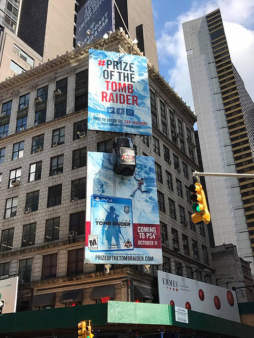 在时代广场的黄金地段下人造雪,这并不是某家百货或者品牌的圣诞营销,而是《古墓丽影:崛起》为了10月11日在PS4平台新发行的游戏所做的宣传。光是下雪还不够,在这块长达20米的立体看板上,还垂直悬挂着一台900公斤重的吉普牧马人。这辆车可不只是为了展出,而是实在的奖品:只要路过的人带着#PrizeoftheTombRaider的标签把照片发到社交网络,就有参与抽奖的机会,奖品就是这辆价值不菲的吉普车。