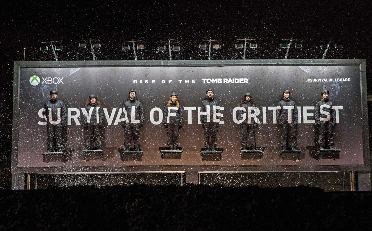 去年11月,为了配合Xbox平台的游戏发行,《古墓丽影》就和微软一起在伦敦展出了一块庞大的多功能广告牌。这块广告牌最厉害的不只是能人造雨雪还能加热,还“大变活人”——8个《古墓丽影》的忠实粉丝在橱窗一样的广告牌里站着,在每日风吹雨淋的严酷环境下,站到最后的那个人就能获得比赛胜利。