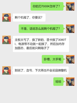 有意思的是,不管是第一位朋友还是第二位朋友,都表示不会再考虑刃系列的整机,前者表示性能还够用,而且新产品的价格太高有点超预算。第二位朋友则表示在显卡价格正常的情况下,选择品牌整机就是“冤大头”,当然,这句话难免有点极端,但是也代表了多数PC DIY玩家的看法。