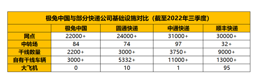 公开资料显示,无论是网点、干线数量,还是自有车辆、大飞机,极兔大都逊于通达系,传导到需求端,便是时效慢、服务差,丢件率和差评率高。