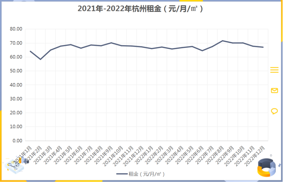 住房租赁需求随之水涨船高。据杭州贝壳研究院发布《2022杭州住房租赁报告》数据显示,2021年杭州租赁人口高达410万人,占常住人口比例40%以上,而2022年杭州租房量环比上涨了13%。在市场需求促动下,杭州租金水平稳定在66-67元/月/㎡,且2022年的均值较之2021年有所提升。