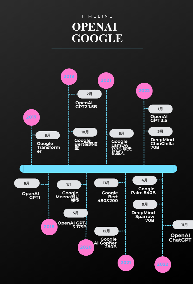 很多公开资料可以轻松查阅到谷歌与OpenAI最近5年在语言模型领域的发展时间线。