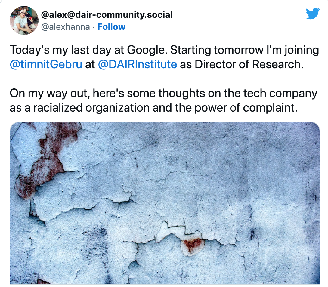 谷歌人工智能伦理团队领袖麦格·米切尔2021年2月遭遇解雇,原因是她分享了同被解雇的前任---黑人女性研究员蒂姆尼·格布鲁当政时期的邮件,米切尔和格布鲁都是谷歌人工智能业务的领袖,格布鲁因揭露面部识别系统中的种族和性别偏差而闻名于世。她们二人致力于消除人工智能偏见方面的研究,建树丰厚,其离职引发了谷歌员工的广泛抗议。