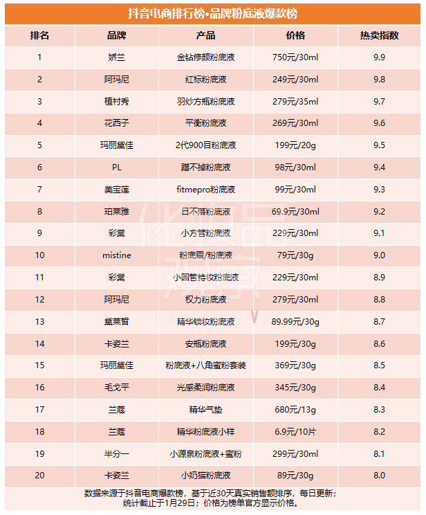 在抖音电商排行榜·品牌粉底液爆款榜TOP20中,金字塔顶部仍被国际大牌牢牢占据,娇兰、阿玛尼、植村秀分列前三,国货品牌花西子、玛丽黛佳、PL、美宝莲、珀莱雅、彩棠等则凭借其明星爆品,挤进前十。
