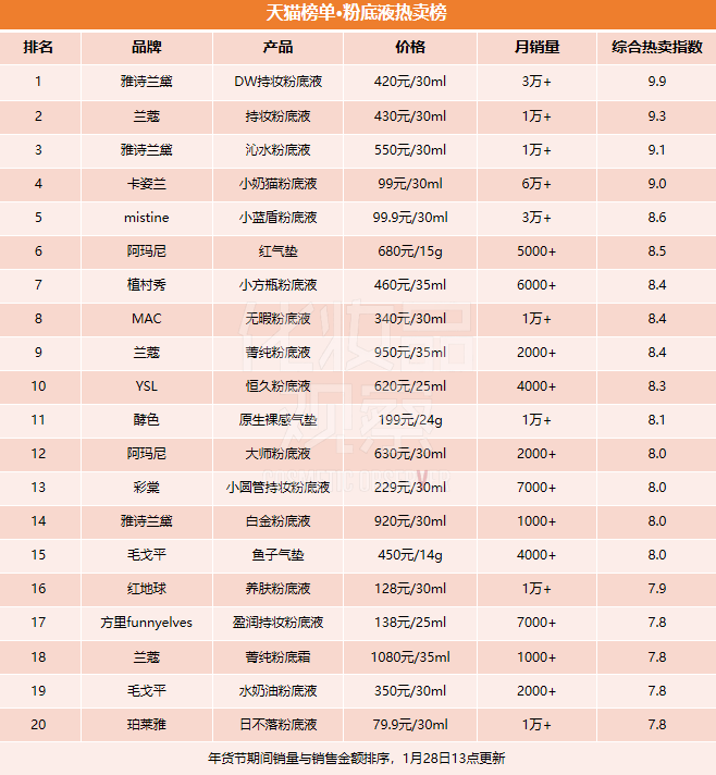 其中,作为底妆产品的重要分支,粉底液普及率及复购率高,市场规模占比较大,是底妆类产品的典型代表。故化妆品观察以粉底液为例,梳理了天猫、抖音平台粉底液热销榜单,以小见大,借此分析底妆市场目前的市场格局:
