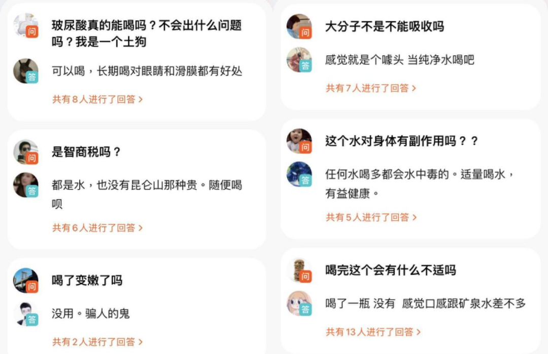 新消费财研社在水肌泉玻尿酸饮用水的淘宝问答中发现,许多未购买的用户时常针对该款水是否能喝、是否有效果、是否有副作用等问题提出问题,而已购买过的用户则普遍称,与普通水并无二致。