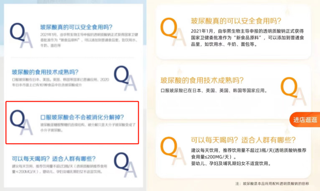 值得注意的是,在被上海市消保委点名后,“水肌泉饮料旗舰店”就对其宣传用语和问答中暗示与涉嫌误导消费者的内容进行了删除,其中关于“口服玻尿酸不会被消化分解掉”的文案目前已经消失不见。