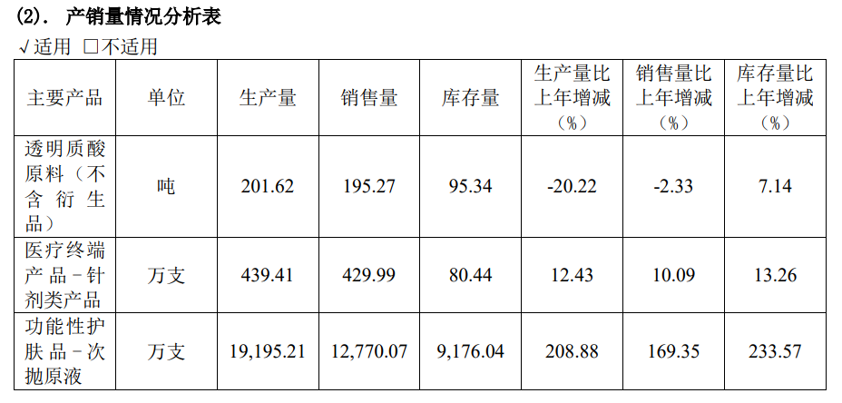 根据华熙生物年报中的产销量分析表,2020年公司透明质酸原料(不含衍生品)的生产量和销售量均较2019年呈现不同程度的下滑,其中生产量同比下降20.22%,销售量同比下降2.33%。而与产销情况相反的是,同年透明质酸原料(不含衍生品)的库存量却比上年同期上升7.14%。