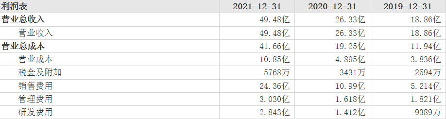 财报显示,于2019年、2020年、2021年及2022年前三季度,华熙生物的销售费用分别为5.21亿元、10.99亿元、24.36亿元、20.3亿元,占总营收27.65%、41.75%、49.24%、50.6%,同比增速为83.74%、110.84%、121.62%、45.31%。其中,2021年销售费用占总营收比例居同行业可比公司首位,同时增速也远高于同期营业收入增速。