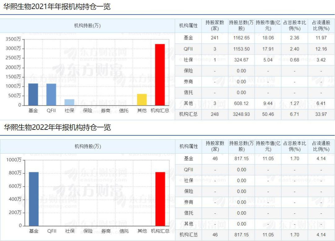 如今的华熙生物,似乎只剩下财报中高达半成的营销费用和投资机构们渐弱的信心。东方财富网数据显示,截至2021年末共有248家机构持仓华熙生物总股本的6.71%,然而到了2022年末,持仓机构数量已下降至46家,占总股本比例仅有1.7%。