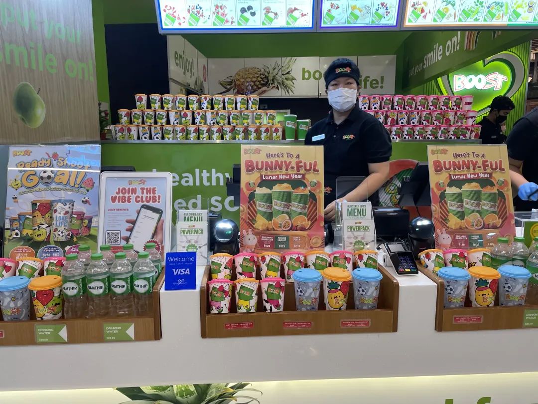 比如不少品牌充满设计感的杯套、以及装满新鲜水果的展示柜,以及各种爆品立牌、宣传电子屏……霸王茶姬用中空杯在奶茶底部加入小礼物的“盲盒奶茶”,在海外店也格外受欢迎。