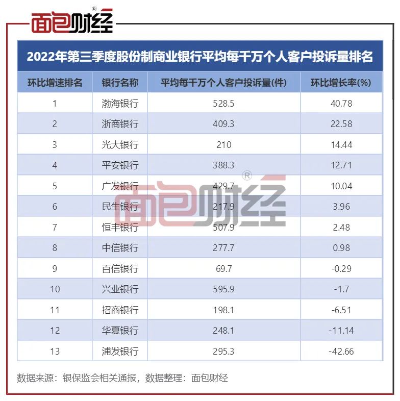 从增速来看,渤海银行投诉量环比增长居股份制银行之首,较上年同期相比,该行投诉量同比增长居前三。