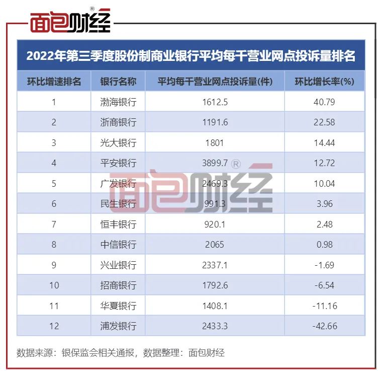 以第三季度平均每千营业网点投诉量进行统计,渤海银行的环比增速依然居首,2022年第三季度该行平均每千营业网点投诉量1612.5件,环比上一季度增长40.79%。