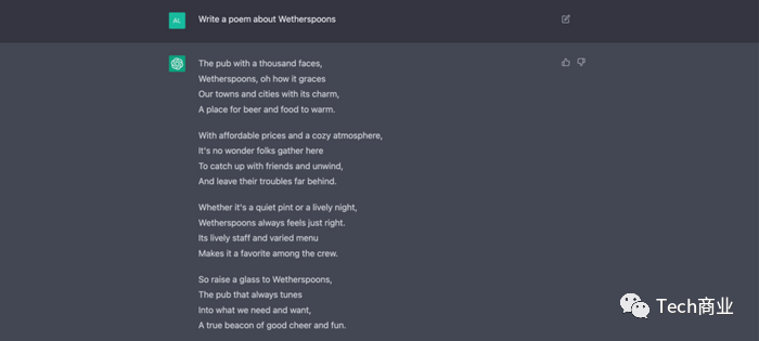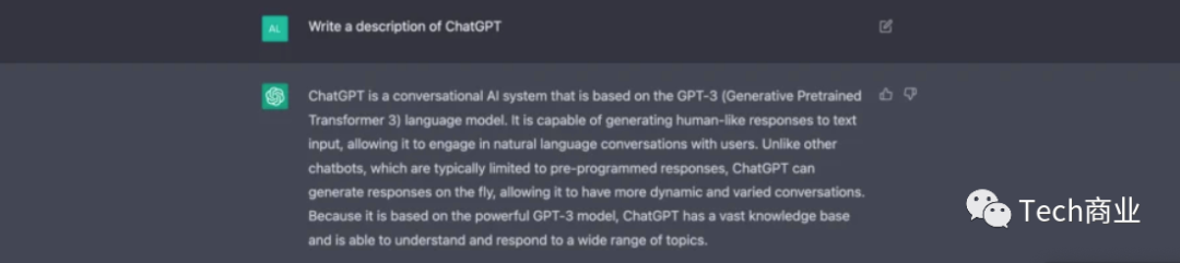 到目前为止,它最常见的用途是创建 ChatGPT——一个功能强大的聊天机器人。为了让你略微了解其最基本的功能,我们要求 GPT-3 的聊天机器人编写自己的描述,如上所示。这有点自夸,但是准确的,可以说写得很好。