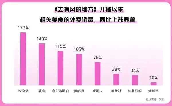 剧中美食的热度也同样疯涨,云南十八怪之一的乳扇搜索量涨幅最大,同比上涨544%,鲜花饼搜索量同比上涨215%;外卖销量也随之拉升。