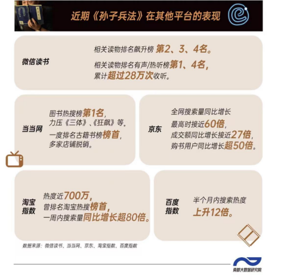 据相关数据显示,近 7 天,《孙子兵法》相关搜索词淘宝搜索量同比增长超 80 倍,销售额同比增长超 40 倍,成交人数增长超 65 倍。没买实体书的就看电子书,然后《孙子兵法》就登上了「微信读书」飙升榜第一名,力压《三体》……