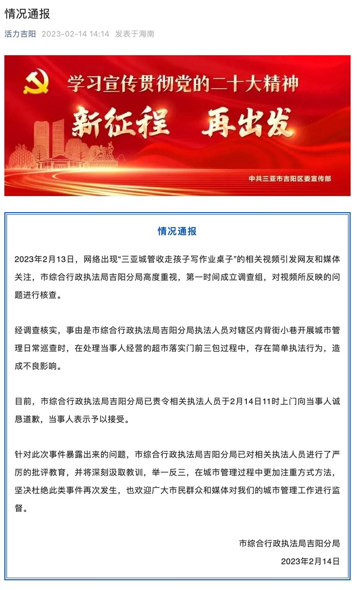 “活力吉阳”微信公众号消息,三亚市综合行政执法局吉阳分局2月14日发布情况通报,2月13日,网络出现“三亚城管收走孩子写作业桌子”的相关视频引发网友和媒体关注,市综合行政执法局吉阳分局高度重视,第一时间成立调查组,对视频所反映的问题进行核查。
