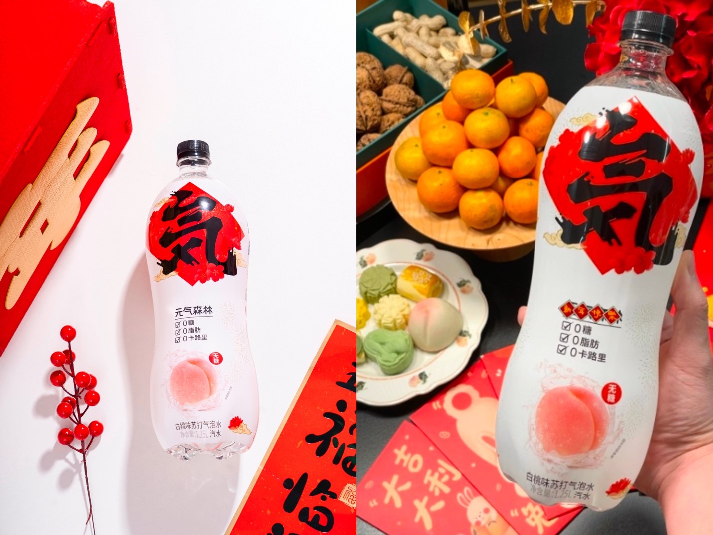 在刚刚过去的2023年春节,元气森林第三年推出为传统中国年量身打造的新年家庭装,1.25L的元气森林春节限定“福气瓶”。它不仅保留了元气森林简约清新的经典风格,又能巧妙地将“张贴福字”的传统习俗引用到瓶身设计上,简洁年轻又年味十足。