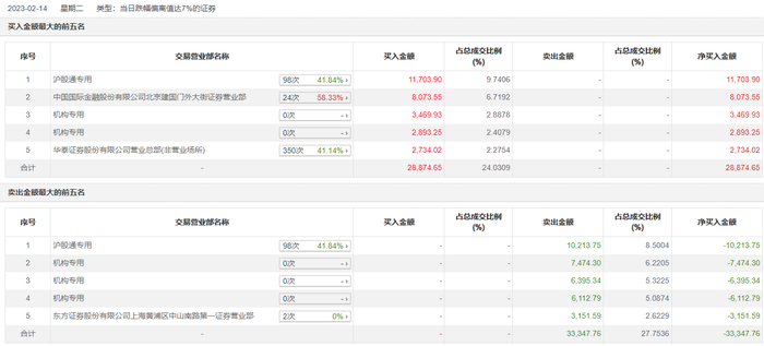 2月14日,国联股份今日跌停,成交额12.02亿元,换手率2.79%。盘后龙虎榜数据显示,沪股通专用席位买入1.17亿元并卖出1.02亿元,2家机构专用席位净买入6363.18万元,3家机构专用席位净卖出2.00亿元。