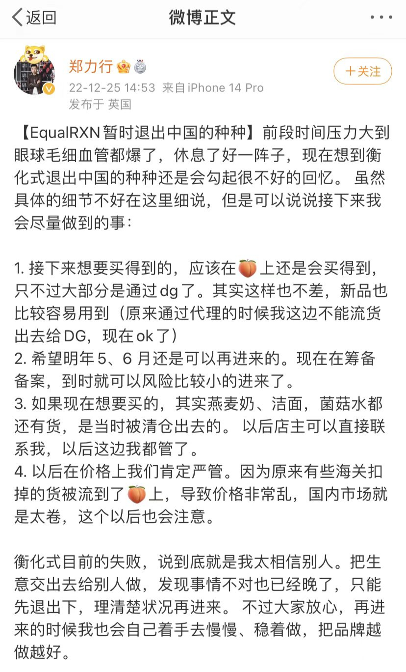 在EQUALRXN衡化式不得不暂时退出中国市场,面临渠道拓展暂时停滞的关键节点,@郑力行 在官方账号对此事件做了说明,真诚坦白实事求是。