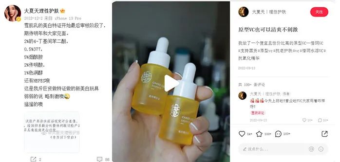 以15%浓度醇溶原型VC出圈的惜玥同样出自专业配方师之手。该品牌创始人@大夏天理性护肤 本身也是一个护肤KOL,在多平台更新新品研发动态、美妆行业真相、年度爱用、行业活动、消费者偏好调研等行业内容,不断强化专业背景,更让人信服,加深品牌好感度。
