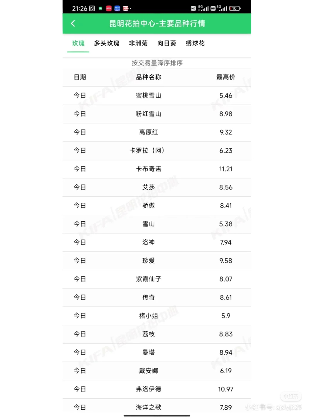 2月7日晚9点斗南花市批发价,最右列为单枝最高价格 图源小红书
