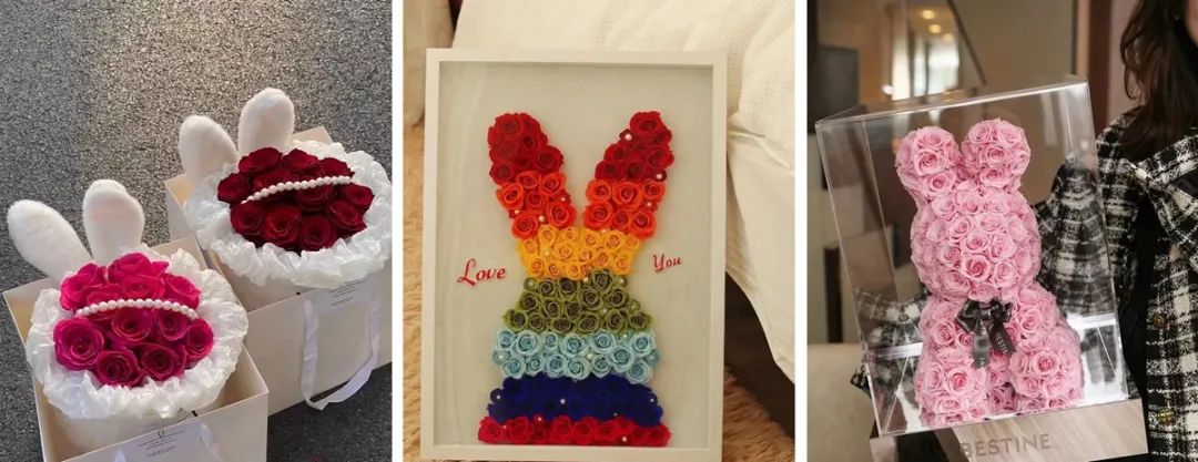爆款的出现也并非无迹可寻。澜生告诉新零售商业评论:“几年前爆火的熊抱鲜花,就是有商家提前打板,在各种社交媒体平台上做了营销推广。有顾客会拿着网上下载的图片来找我们定做,粉粉嫩嫩的,确实漂亮。”今年春节期间的兔子花束也是类似的出圈路径。