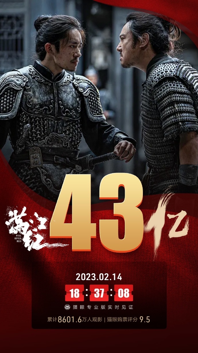 猫眼专业版数据显示,电影《满江红》上映24天,总票房破43亿元。