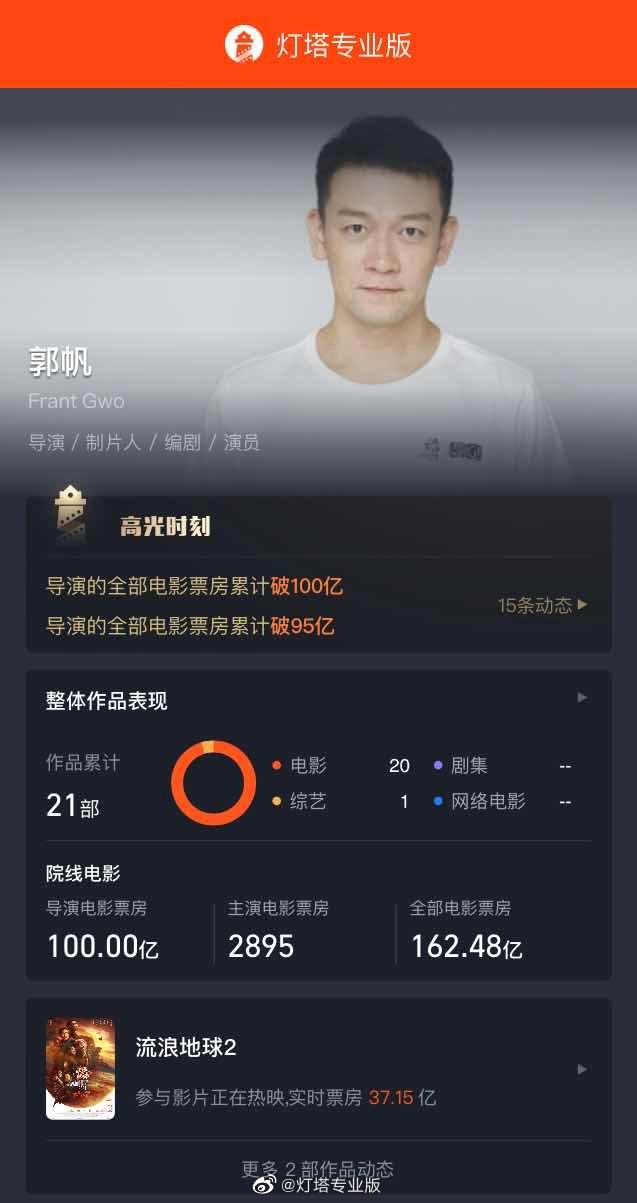 据灯塔专业版数据,截至2月14日18时,影片《流浪地球2》票房达37.15亿,助力导演郭帆@郭帆FrantGwo 累计导演电影票房突破100亿。