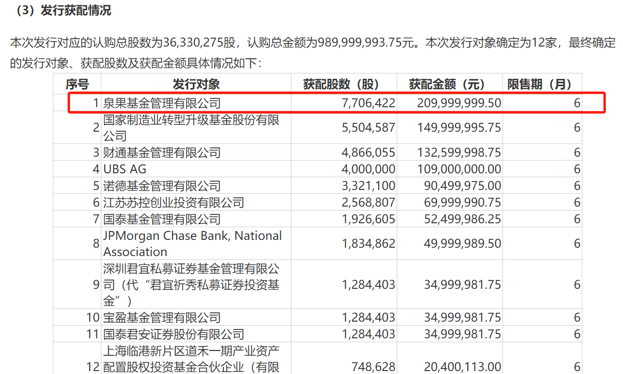 最终,泉果基金总计获配770.64万股,获配金额为2.1亿元,位列第一位。而被业内称为“定增王”的财通基金,获配了486.6万股,获配金额为1.33亿元。国泰基金、宝盈基金分别获配了192.66万股、128.44万股。