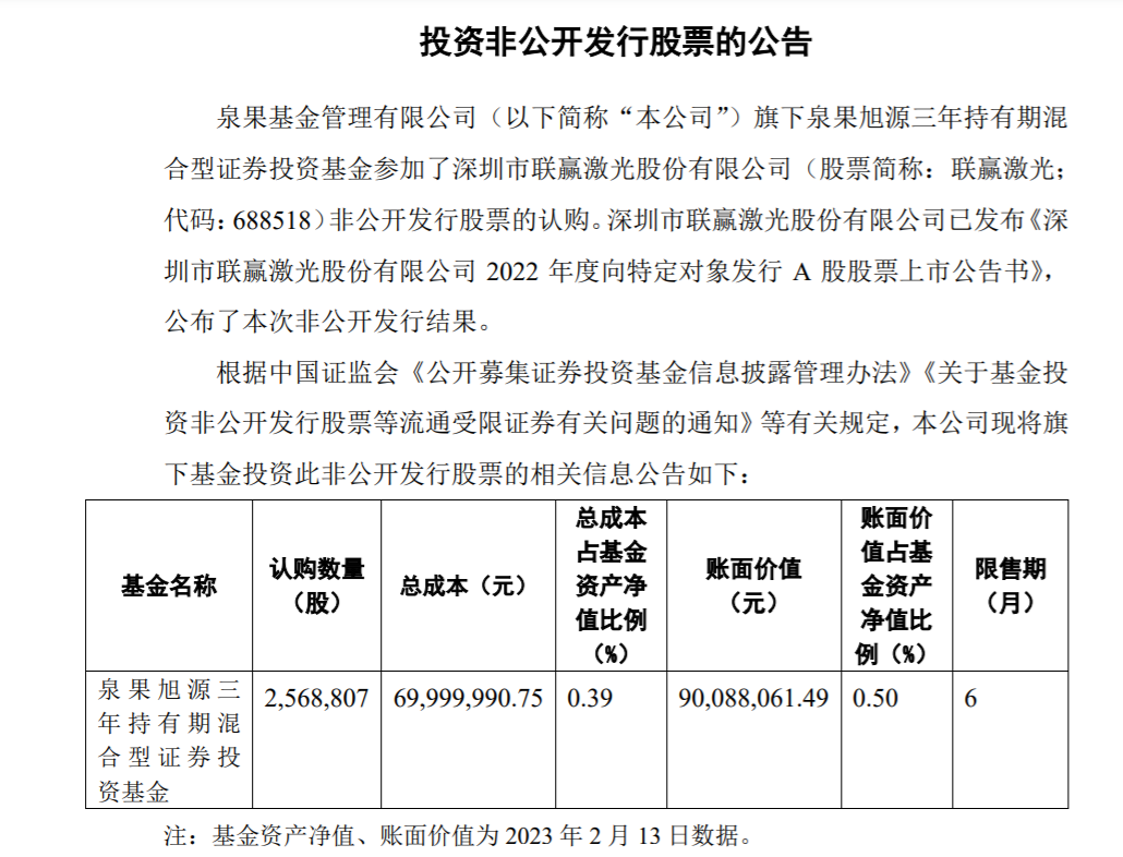 2月14日,泉果旭源发布公告称,截至2月13日,该基金认购了256.88万股的联赢激光(688518.SZ),总成本近7000万元,账面价值9008.8万元,占基金资产净值比例的0.5%。