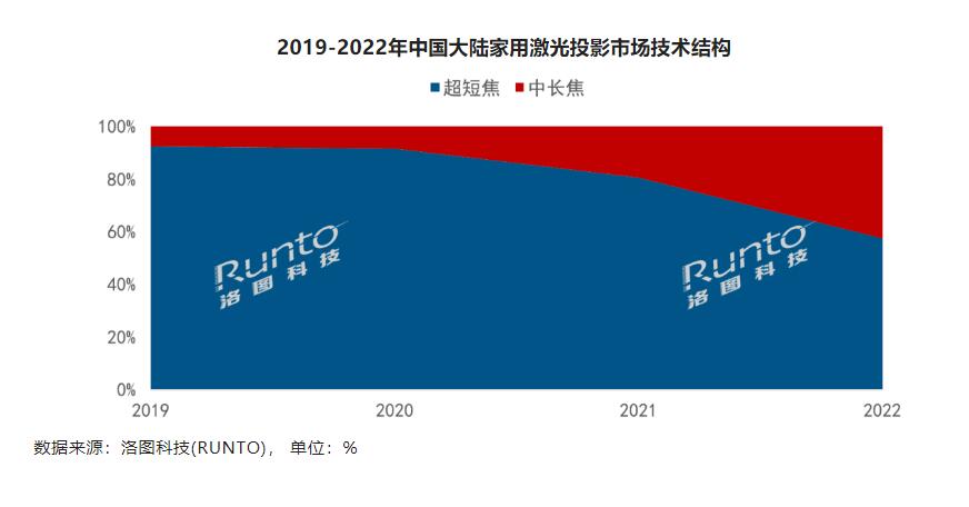 去年中长焦激光家用投影的翻倍式的高速增长,也改变了激光家用投影的超短焦“一家独大”的局面。数据显示,超短焦与中长焦技术的出货量比例从2021年的81:19变为2022年的57:43。