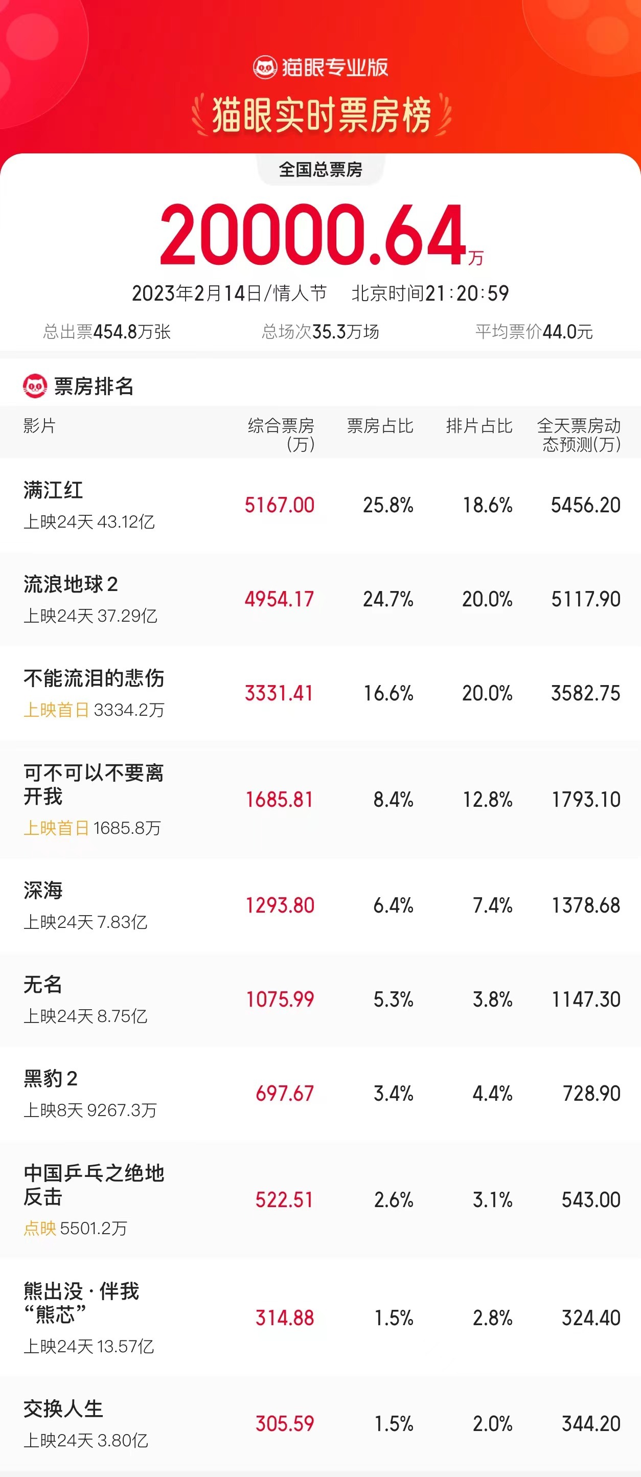 猫眼专业版数据显示,2023年2月14日21时20分,2023年情人节(2月14日)总票房突破2亿元。
