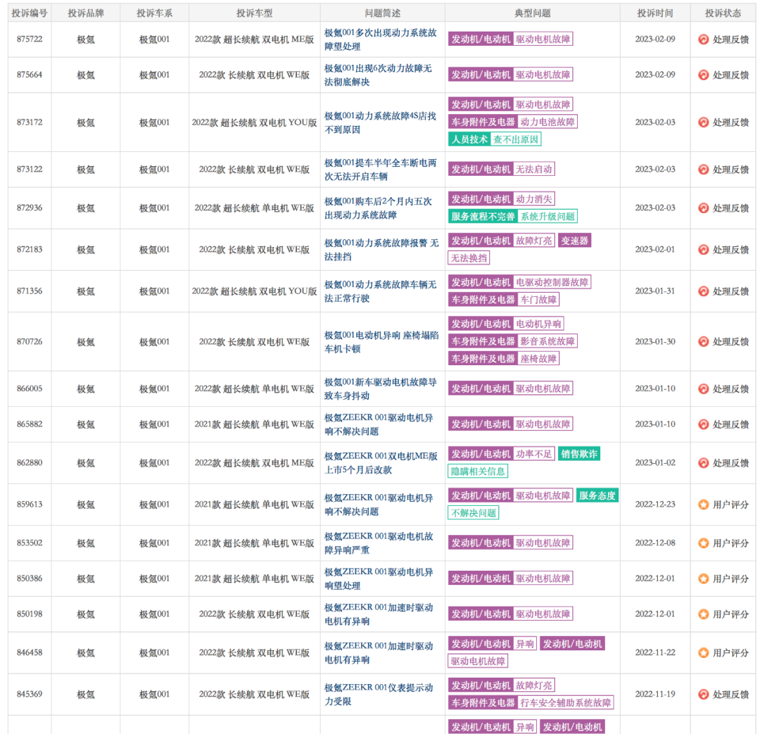 截至2月14日,极氪001在车质网上的投诉数量达到877条。投诉内容最多的是承诺不兑现、服务收费与销售欺诈。