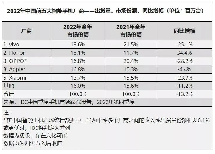 IDC最新发布数据显示,2022年中国智能手机市场出货量时隔10年再次回落到3亿以下,同比下降13.2%至2.86亿台。