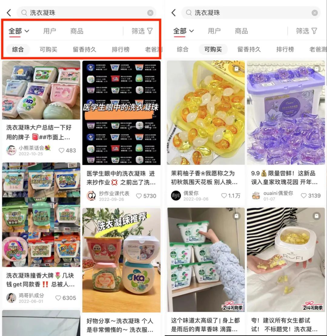 3、搜索结果中新增“可购买”标签。可购买标签下的笔记均为带有商品购买链接的“商品笔记”,用户可在笔记中点击左下角商品卡直达商品下单页进行购买。据悉,2022年初,小红书推出“回家开店”计划,并首次上线了商品笔记,用户可以在小红书信息流中实现“边逛边买”,商品笔记也可以获得专属流量。