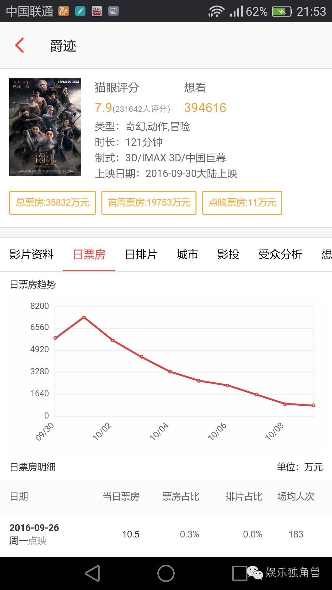 截至2016年10月9日,《爵迹》已经上映9天,累计票房3.58亿,与乐视影业在上映前曾经设想的票房目标相距甚远,国庆档热潮已退,票房后续无力。也就是说,这部以“国内首部全真人CG电影”为噱头打响第一炮、海报预告造势两年、带着浓厚“郭敬明导演作品”色彩的现象级电影,已经搁浅在岸了。