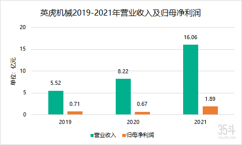 业绩方面,据英虎机械财报显示,英虎机械2019-2021、2022年上半年的营业收入分别为5.52亿元、8.22亿元、16.06亿元和7.26亿元,实现扣除非经常性损益后的归母净利润分别为7115.22万元、6710.55万元、1.89亿元和8973.05万元。