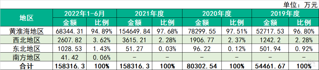 从地区分布来看,公司的产品销售主要集中在黄淮海地区,包括河北、河南、山东、安徽等多个省份,并逐步向陕西、甘肃、宁夏、内蒙古等西北、东北地区进行市场拓展。报告期内,英虎机械在黄淮海地区实现的销售收入占主营业务收入的比例分别为 96.80%、97.51%、97.68%和 94.89%,区域集中度较高。