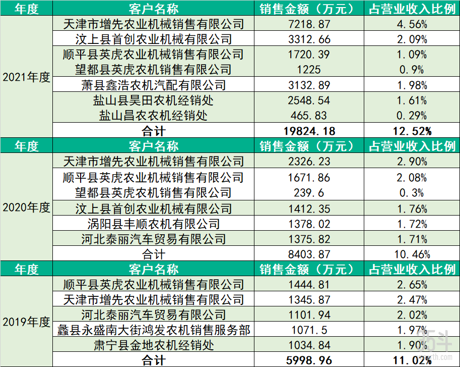 2021年英虎机械的前五大客户分别为天津市增先农业机械销售有限公司、汶上县首创农业机械有限公司、顺平县英虎农业机械销售有限公司(望都县英虎农机销售有限公司)、萧县鑫浩农机汽配有限公司和盐山县昊田农机经销处(盐山昌农农机经销处),其占比分别为4.56%、2.09%、1.99%、1.98%和1.9%,合计占比12.52%。