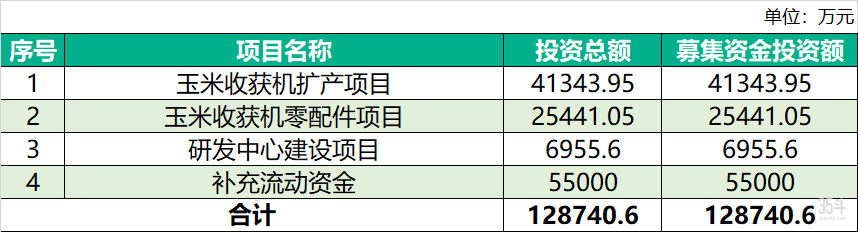 招股书显示,英虎机械此次拟公开发行不超过2500 万股,即不超过本次公开发行后公司总股本的25%,不进行老股转让。计划募集资金约12.87亿元,公司承诺,募集的资金扣除发行费用后,将全部用于扩大生产项目和补充流动资金。其中5.5亿元将用于补充流动资金;4.1亿元用于玉米收获机扩产项目;2.5亿元用于玉米收获机零配件项目;0.69亿元用于研发中心建设项目。