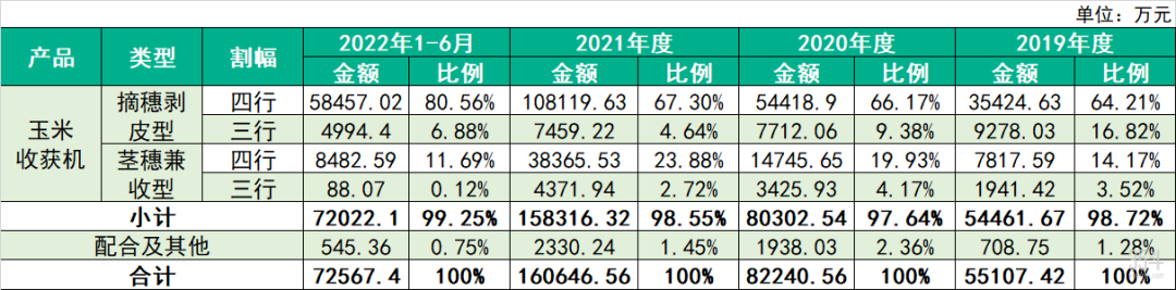 从各产品线来看,公司的主要产品为自走式玉米收获机,其机型分为摘穗剥皮型玉米收获机和茎穗兼收型玉米收获机,收获行数分为三行和四行,是国内玉米收获机的主流机型。其中,2022年1-6月,四行的摘穗剥皮型玉米收获机销售收入占上半年总营收的80.56%,是公司营业收入的主要来源。