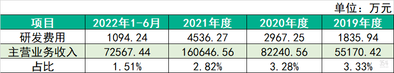 在产品研发方面,英虎机械2019-2021年研发费用投入分别为1835.04万元、2697.25万元、4536.27万元,其占比分别为3.33%、3.28%、2.82%;同时英虎机械拥有1125名员工,其中研发人员82人,仅有7.29%的占比。相对来说英虎机械的研发投入比例较低。