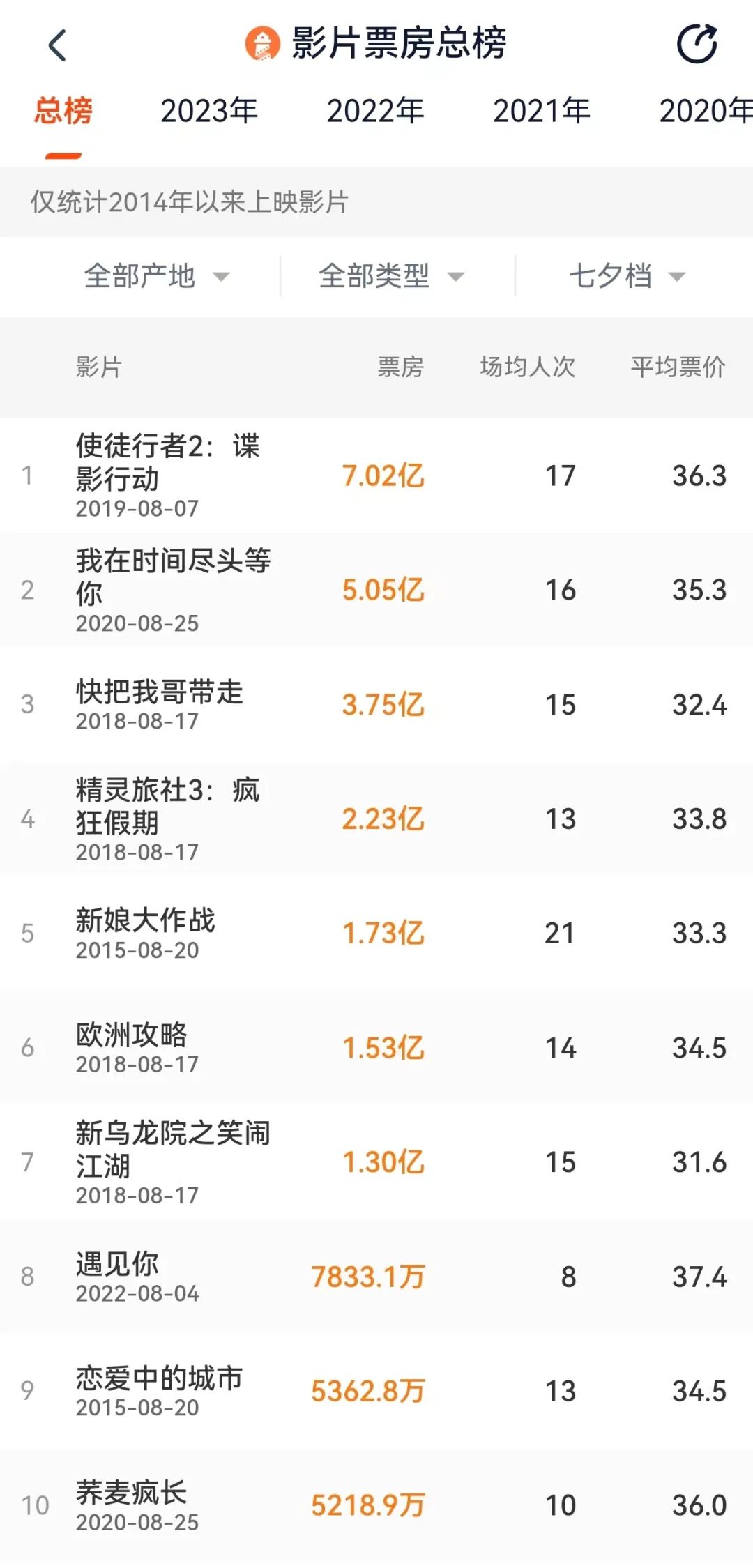 七夕基本被包裹在暑期档中,跟春节档前后一样,新映爱情片同样会面临被大片围剿的局面,市场空间有限。选择这一天上映的影片,类型并不局限在爱情片中。排在七夕档历史票房前列的有《使徒行者2:谍影行动》《快把我哥带走》《精灵旅社3:疯狂假期》等五花八门的类型片。