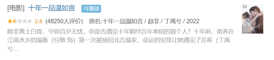 但这是难以持续的,观众的审美能力始终处于不断提升的过程中,后来者总要为前人的负面评价买单。去年的情人节档《十年一品温如言》,大多数观众13:14开始看第一场,到下午16点#难看#词条就出现了,17点就登上了微博热搜第一。第二天,豆瓣开分2.9,基本宣告了票房的“死刑”。这也直接影响了今年情人节档的爱情片观影热情,在电影上映前,已经有不少观众在豆瓣留下“情人节的电影一看就是烂片”的前瞻式短评,整个档期的负面印象已经根深蒂固。