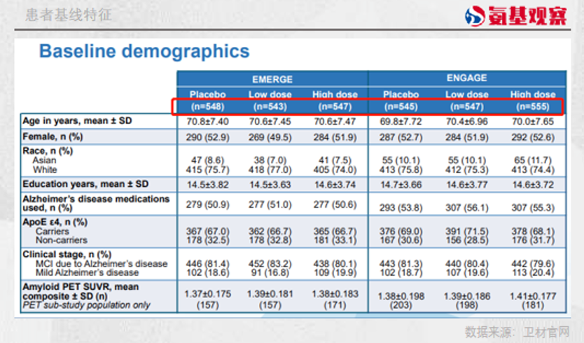 Aduhelm获批上市是基于一项名为EMERGE的三期临床试验。在这项临床试验中,安慰剂组、低剂量治疗组和高剂量治疗组患者数量都在500人以上。