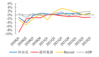 除德科集团外,2022年第三季度其他三家海外人力资源公司的净利润率都较 2019 年同期高出1-2个百分点。得益于净利润率的提高,除德科集团外,其他三家公司的净利润都较疫情前有较大幅度的提升,任仕达、德科集团、Recruit、ADP四家公司2022年第三季度的净利润分别恢复至2019年同期的 164.3%/60.3%/155.5%/148.9%。